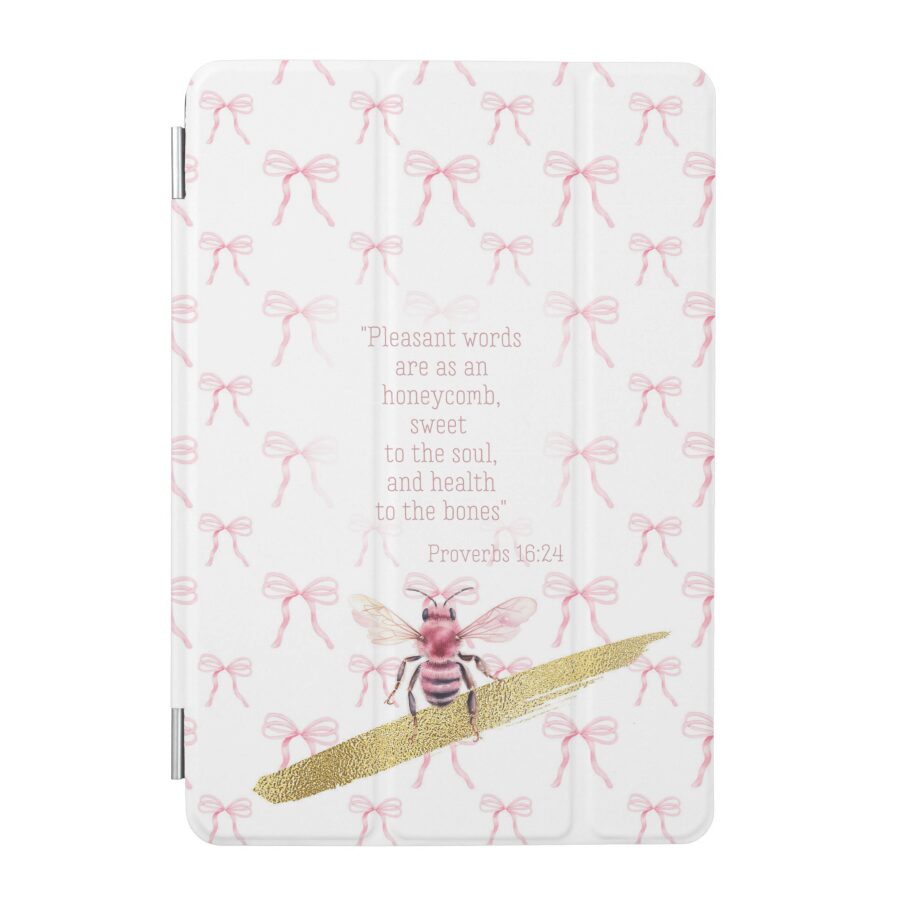 Make your device a symbol of grace. Decked with the Dainty White design: a crisp white canvas layered with a delicate pink bow grid, showcasing a bottom-centered scripture panel resting on a sheer white overlay, gently grounded by a charming pink watercolor bee motif for a graceful finishing touch. Premium trusted-brand personalized printing