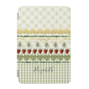 Monogram style with bold, colorful presence. Decked with the Green Garden design: a lively green check–plaid composition tailored with a custom name detail and finished with shimmering gold, hearts, and hand-painted bees and strawberries. Premium custom printmaking on trusted brands.
